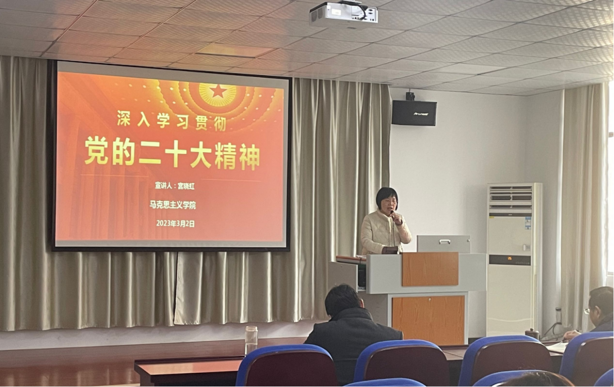 为深入学习宣传贯彻党的二十大精神,3月2日上午,校党委讲师团成员、马克思主义学院副院长宫晓虹应邀来丝瓜视频 开展党的二十大精神专题宣讲,学院全体教师及学生代表在化工楼南207报告厅参加学习。