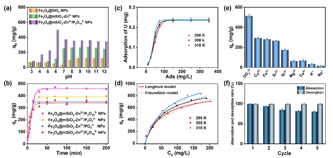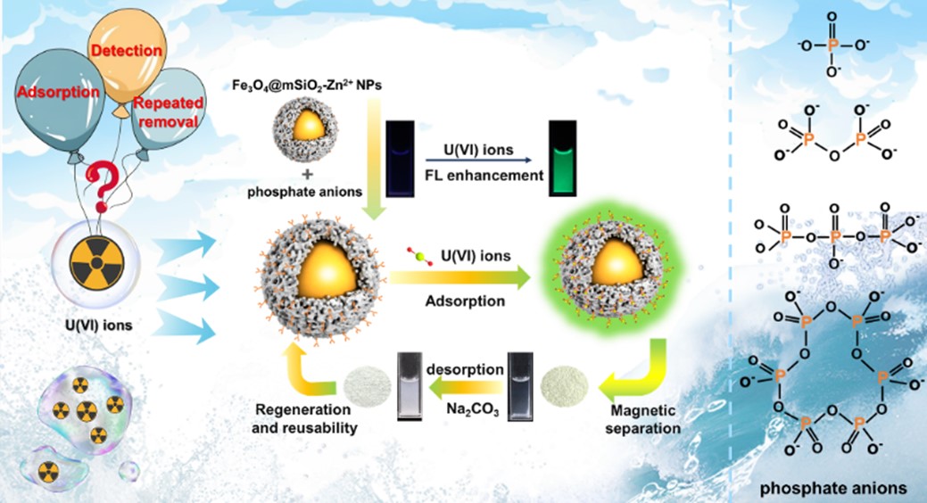 研究基于前期实验结果和理论基础,提出出一种通用方法,用于合成一系列磷酸盐阴离子(如:PO43-、P2O74-、P3O105-和P6O186-)修饰的磁性介孔二氧化硅纳米颗粒(Fe3O4@mSiO2-Zn2+NPs)。磁性颗粒较大的介孔比表面积和丰富的磷酸基团为捕获U(VI)离子提供了强力的铀结合位点,其中三聚磷酸离子功能团修饰的磁性介孔二氧化硅纳米颗粒(Fe3O4@mSiO2-Zn2+/ P3O105-NPs)的吸附容量高达885.90 mg·g-1(298 K),远高于未改性或其他磷酸盐阴离子改性的磁性介孔二氧化硅纳米颗粒。同时,磷酸盐阴离子结合位点和介孔大比表面积极大地限制了U(VI)离子的荧光振动失活,吸附后的绿色荧光迅速增强(180秒内),从而实现对U(VI)离子的可视化检测,其最低检测限为4.5 nmol·L-1),远低于世界卫生组织(WHO)规定的饮用水标准。即使经过5次循环,该吸附剂仍能保持 80.21% 的原始吸附容量,在检测和去除海水中的U(VI)离子方面表现出优越性。上述研究成果为进一步开发集检测、吸附、除去等多功能材料提供了崭新的研究思路,有效维护突发情况下人们的生命与健康安全,促进核工业的可持续发展。