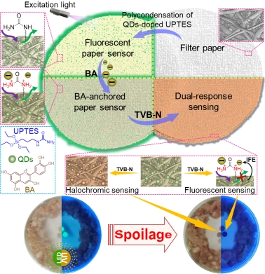 总挥发性盐基氮(TVB-N)是蛋白类食品新鲜度的有效指示成分,利用这一行为特性,团队提出了一种具有快速和不可逆读出的显色/荧光变化双响应传感策略用于蛋白类食品新鲜度无损监测。以滤纸为基底,利用掺杂CdTe量子点的硅烷偶联剂在滤纸上缩聚制备荧光试纸,然后通过静电作用将蓝莓花青素(BA)等pH敏感的显色化合物锚定在试纸表面,制得对TVB-N敏感的双响应纸传感器。系统考察了传感器的微观结构和表面化学组成、荧光性质、荧光传感和BA变色机理、传感动力学、双信号响应的选择性和不可逆性。所得纸传感器对TVB-N表现出快速(≤1 min)响应性能,工作范围宽(0.001-50 ppm),LOD低至0.01 ppm(氨),且双信号响应在去除TVB-N后仍可持续至少7天,有效避免了可逆变色传感可能引起的假阴性结果。最终纸传感器成功用于猪肉、虾和鸡蛋等真实食品在不同储存温度下的新鲜度实时监测,并与国标凯氏固氮法进行对比,两者的结果相当,证实了纸传感器用于蛋白类食品变质传感高的可行性和可靠性。
