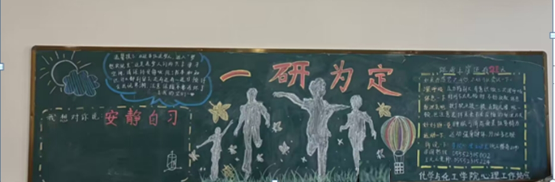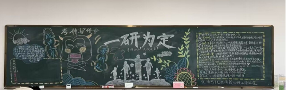 化工学院在化工北楼102、103设置考研自习室以解决考研学生实际困难、方便学生考研。自习室学习氛围浓厚,学生自觉遵守自习室的各项规定。针对学生冲刺阶段,学院心理工作站秉承“多关心、少干扰,强心理、做实事”的原则,在深夜考研学生回寝休息后,为他们制作了“一‘研’为定”主题板报,意在鼓励考研学生如有困难主动求助、营造浓厚的考研氛围,并在黑板上提供了辅导员、学院、心理中心等多方求助渠道信息。考研学生第二天到自习室看到板报,纷纷表示十分暖心、倍受鼓舞。