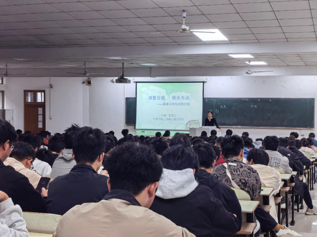 10月25日上午,化学与化工学院在佳山校区教三南103举办“调整自我,快乐生活”新生入学适应心理讲座。化工学院心理工作站站长朱圣兰老师主讲,25级全体新生聆听此次讲座。