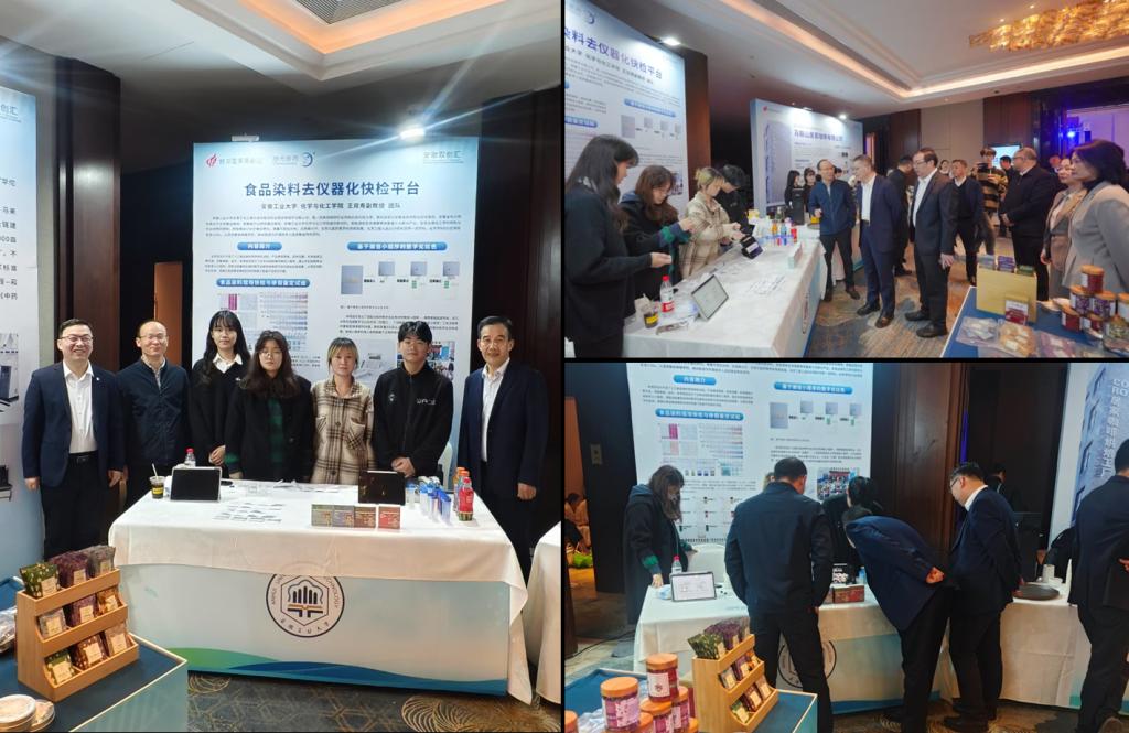 化学生物学与制药工程系王双寿副教授团队携其最新科研成果—食品染料去仪器化快检平台参加了项目展示,活动期间,中国科学院院士马大为、安徽工业大学副校长郑啸、安徽皓元医药有限公司董事长郑保富以及马鞍山市卫健委、马鞍山市医保局、慈湖高新区管委会等有关部门领导来到展台就食品安全快检产品进行了现场交流,王双寿副教授就快检产品的设计研发、使用方法、应用场景等方面进行了介绍,获得了各位领导和嘉宾的高度认可。(撰稿:王双寿;审核:韩新亚、黄宇弦)
