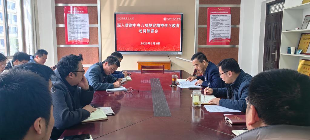 3月31日上午,化学与化工学院党委在化工楼南221会议室召开深入贯彻中央八项规定精神学习教育动员部署会。学院领导班子成员、党委委员、党支部书记参加了会议,院党委书记黄宇弦主持会议。