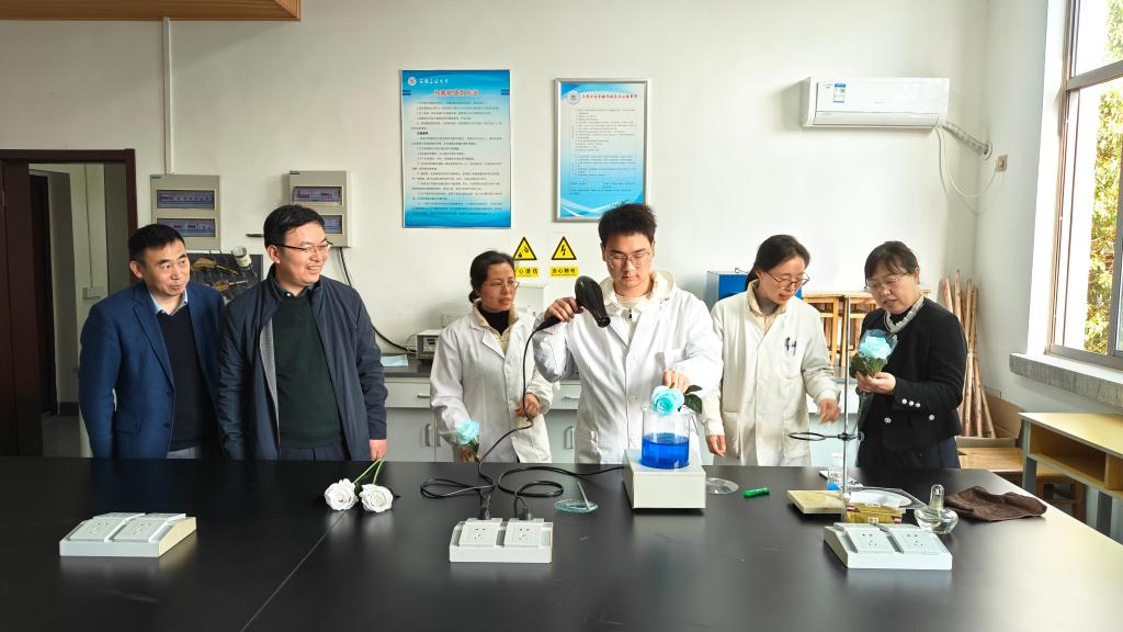 在无机化学实验室,调研组特别驻足观摩了师生共同开展的创新兴趣实验。韩新亚高度肯定此类实践:“将专业实验与科创项目有机融合,既彰显化学学科特色魅力,又通过‘沉浸式’教学有效激发学生探索热情。”他特别强调,要系统规划兴趣实验课程体系,通过“基础实验+创新模块”的梯度培养模式,持续提升学生自主探究能力和工程实践素养。