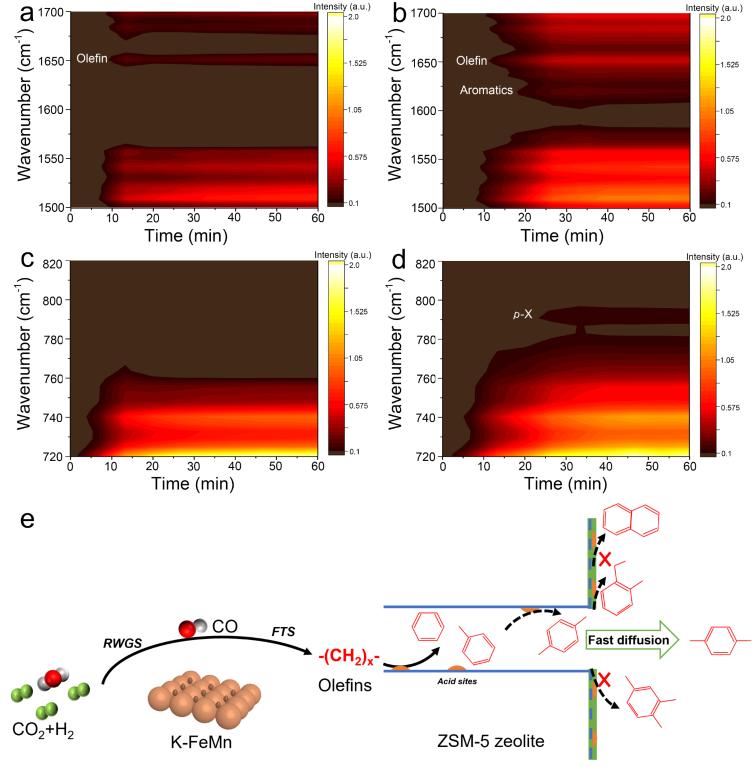 机理研究表明,钾和锰改性的铁基材料促进了轻烯烃中间体的形成,而中空结构ZSM-5具有钝化的外表面酸位点,能有效抑制对二甲苯的异构化和烷基化反应并能促进对二甲苯的扩散,使二甲苯中对二甲苯比例达到65.1%。本研究通过特定催化剂设计和空间分离工艺,克服了局部热力学平衡,为可持续且高效的对二甲苯生产开辟了新途径。