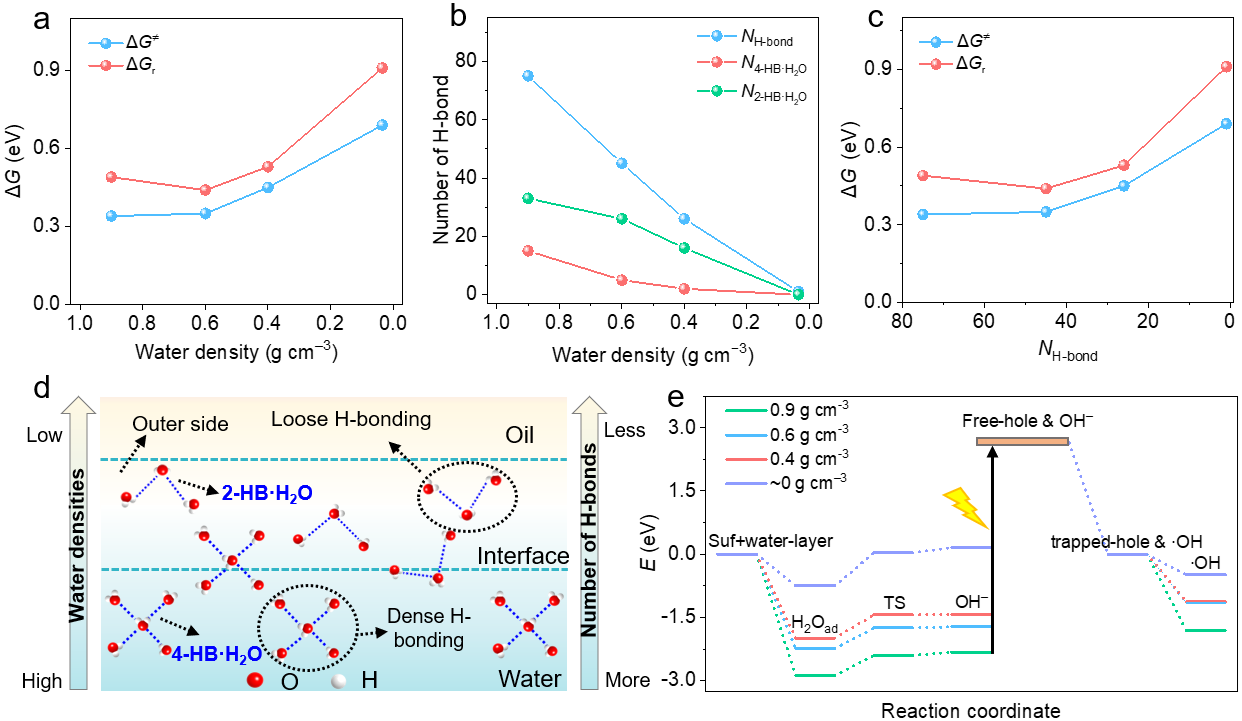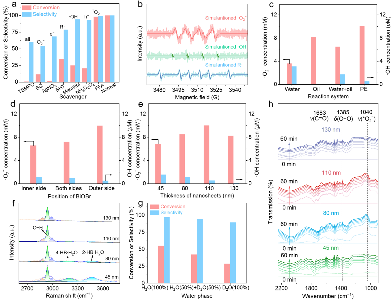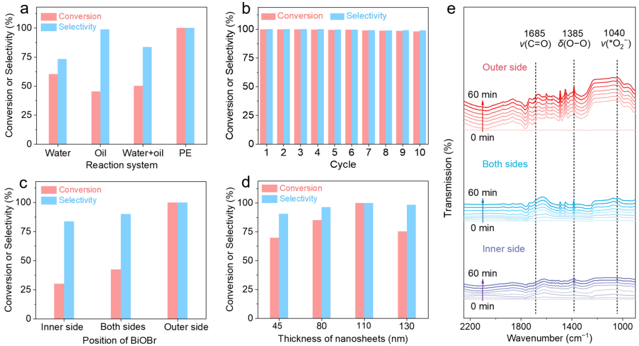 针对上述难题,研究团队设计了一种以改性二氧化硅(SiO2)为乳化剂、溴氧化铋(BiOBr)为光催化剂的Pickering乳液界面光催化体系。通过将BiOBr精准固定于乳滴界面外侧,体系在可见光下有效促进有利的超氧阴离子自由基(∙O2‒)生成,同时抑制羟基自由基(∙OH)形成。在不添加任何牺牲剂的条件下,该体系实现>99.0%的乙苯转化率和>99.0%的苯乙酮选择性。机理研究进一步揭示,Pickering乳滴界面独特微环境是实现高选择性的关键:界面外侧松散的氢键抑制了水分子解离与∙OH的生成,有效防止了过度氧化;同时,界面外侧富氧疏水环境促进了氧气吸附与∙O2‒的形成,显著提升了界面反应动力学,从而在温和条件下实现苯乙酮的高选择性合成。为探索该技术的实际应用潜力,研究团队构建了一种连续流动光催化体系,克服了传统间歇反应中催化剂分离回收的难题。该体系在长达200小时的连续运行中表现出良好的稳定性,乙苯转化率维持在约81.6%,苯乙酮选择性约92.3%,展现出较好的应用前景。