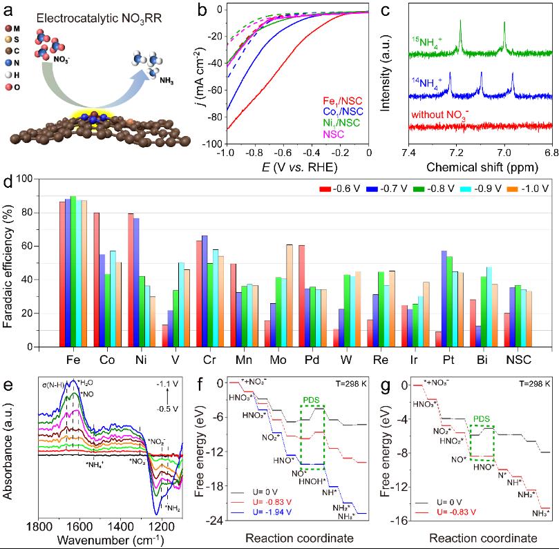 进一步以电化学硝酸根还原为模型反应,选取一元金属单原子位点(M1/NSC,M = Fe、Co、Ni、V、Cr、Mn、Mo、Pd、W、Re、Ir、Pt、Bi等)催化剂系统评价了其在电化学硝酸根还原反应中的性能,并利用原位衰减全反射傅里叶变换红外光谱(ATR-FTIR)和密度泛函理论(DFT)计算揭示了Fe1/NSC催化剂在硝酸还原反应中的催化机制和活性来源。最后,以Fe1/NSC为阴极组成Zn-NO3−概念性电池器件,其展示出高功率密度和很好的稳定性。该研究为氮氧化物资源高效利用与能量供给耦合提供了有意义的探索与实践。
