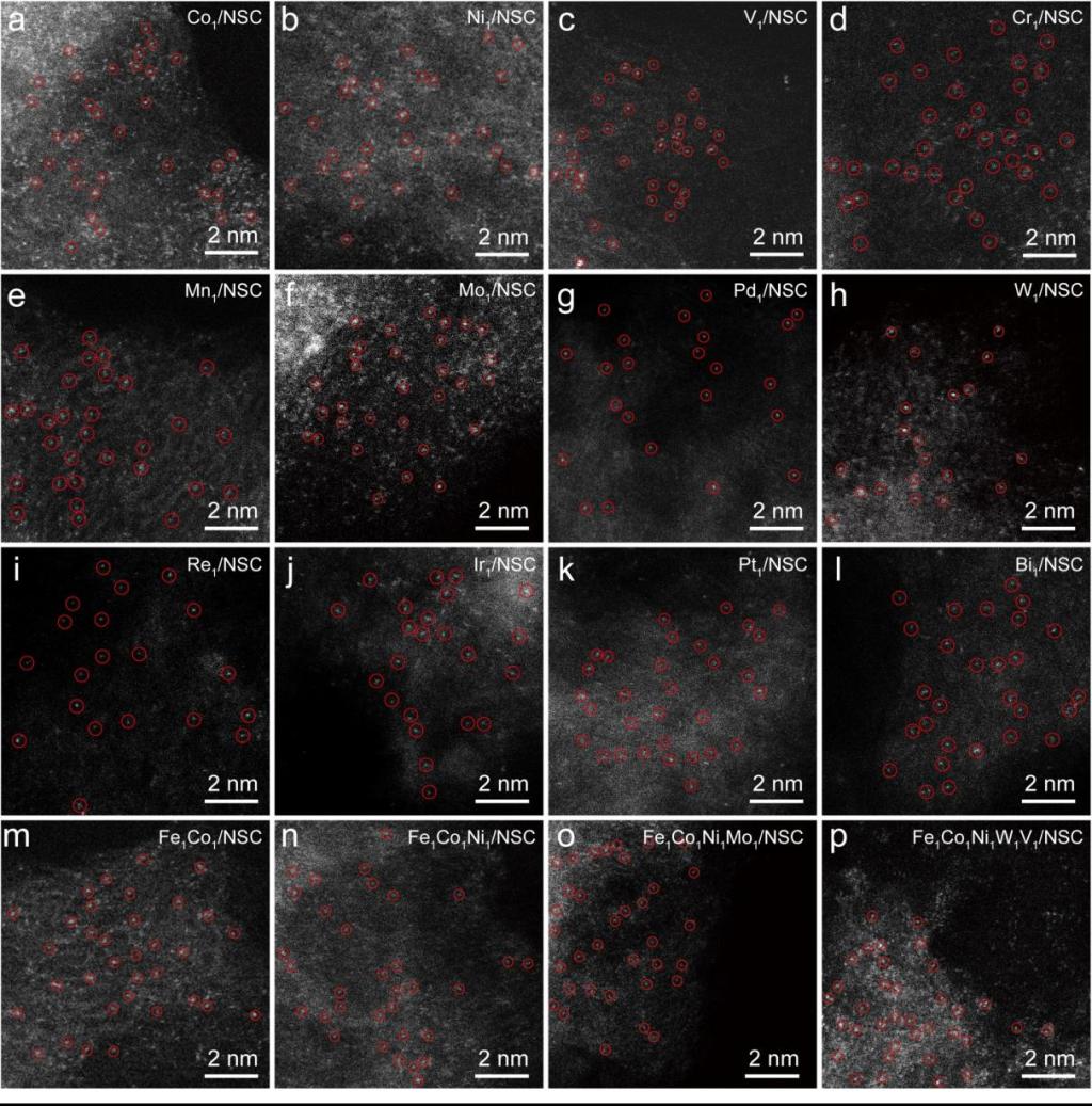 本研究提出了一种基于异电荷耦合效应(HCCE)新策略,其利用质子化聚合物前驱体的正电荷与金属离子的负电荷之间的静电相互作用,成功构建了17种单原子位点材料,并实现了金属中心从一元到多元金属活性中心的可控调节。此外,该方法还能实现单原子位点材料的宏量合成,一次可以实现50克级可控合成(以Fe1/NSC为例)。