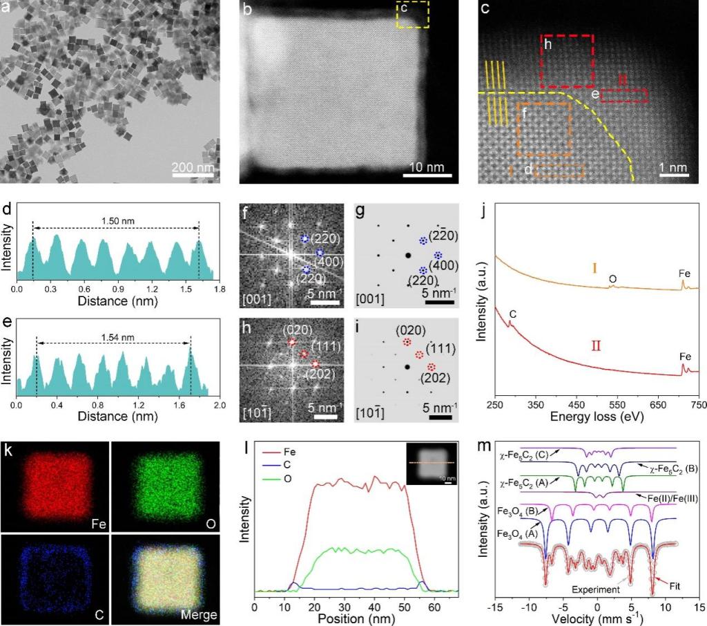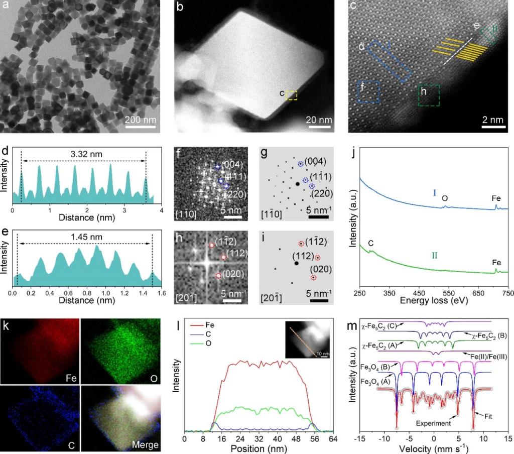 (图1. 暴露{202}晶面的Fe3O4@χ-Fe5C2纳米立方体的结构表征