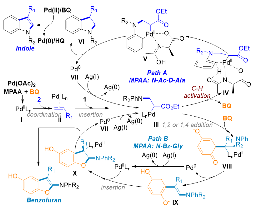 对于芳基仲胺类底物,苯胺与烯烃的反应过程中,钯催化剂会发生烯烃插入得到迁移插入中间体,机理实验表明,苯醌添加剂可以抑制插入中间体发生β-H消除。插入中间体在氨基酸配体的辅助作用下发生邻位碳氢键活化最终生成吲哚类化合物。同时,调控氨基酸类配体结构可以抑制邻位C-H活化的发生,插入中间体与苯醌反应生成苯并呋喃类化合物。