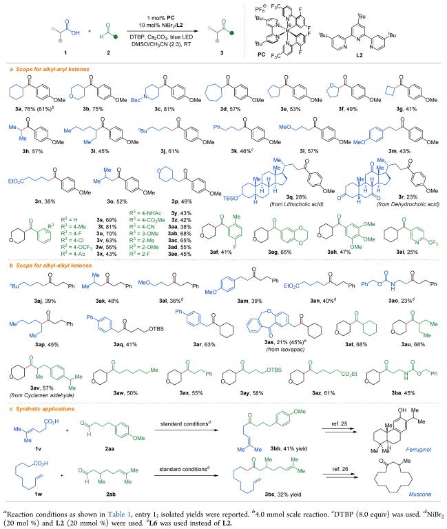 团队创造性地使用叔丁基过氧化物作为氧化剂和氢原子转移试剂,将烷基羧酸盐的单电子氧化脱羧和醛的氢原子转移有机结合起来,通过镍催化的自由基-自由基交叉偶联,首次实现烷基羧酸与醛的直接脱羧交叉酰基偶联反应。该反应具有广泛的底物普适性,三氟甲氧基、酮、醚、酯、酰胺、氰基等官能团均能较好地兼容。此外,复杂分子的后期官能团转化和关键中间体的合成,进一步说明了该反应潜在的实用价值。机理研究表明该反应同时存在烷基自由基和酰基自由基;通过密度泛函理论(DFT)计算进一步说明镍催化的自由基-自由基交叉偶联优先发生Ni(I)物种对酰基自由基的单电子氧化加成。