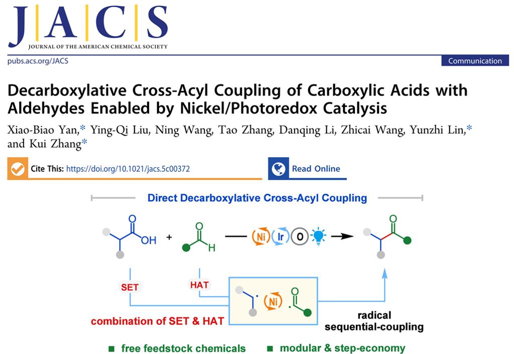 酮类化合物是广泛存在于生物活性分子、精细化学品和有机功能材料中且具有独特优势的结构单元。传统的合成方法中,过渡金属催化的酰基化偶联反应通常需要使用酰氯、酸酐等活化酰基化试剂,一定程度上限制了其在科学研究、实际生产中的应用。从原子和步骤经济性角度考虑,发展由廉价易得的大宗化学品直接获取非对称酮类化合物的交叉酰基偶联反应具有重要的意义和价值,但极具挑战性。