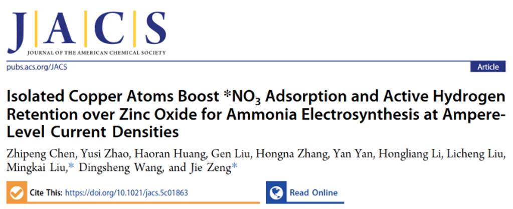 近日,我校化学与化工学院多相催化团队在电催化硝酸盐还原合成氨方向取得新进展,相关成果发表在国际顶级期刊《Journal of the American Chemical Society》上。《Journal of the American Chemical Society》是全球化学研究领域最具影响力的顶级学术期刊之一,主要收录在化学、材料、生物和能源等领域原创性的学术研究成果。我校为论文第一单位,化学与化工学院陈志鹏资格教授为论文第一作者,刘明凯教授、曾杰教授为共同通讯作者。研究工作得到了国家杰出青年科学基金(延续资助)、国家重点研发计划、腾讯基金会科学探索奖、安徽省杰青/优青等项目的支持。