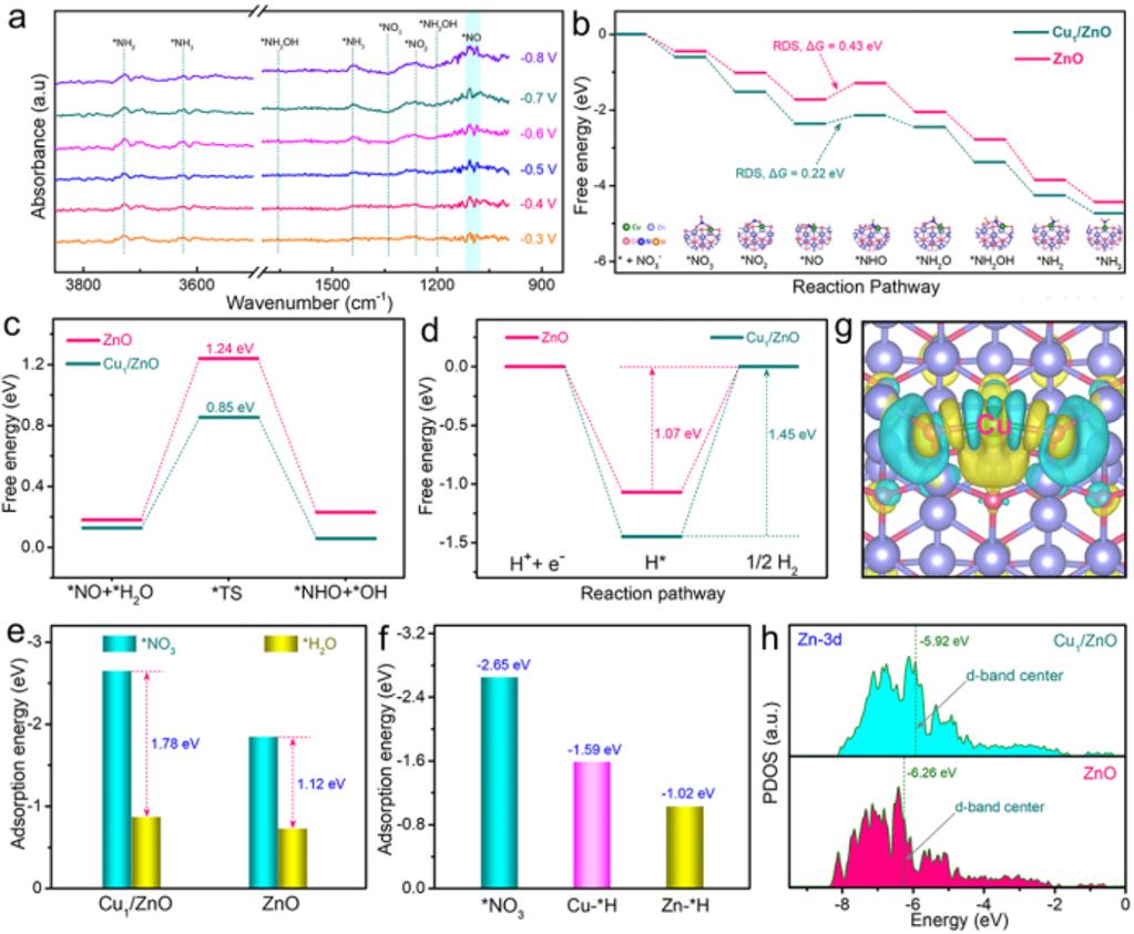 为了解决这一难题,曾杰教授团队开发了一种ZnO载体分散的Cu单原子合金氧化物催化剂(Cu1/ZnO)。该催化剂体系中,原子级分散的Cu位点增强了对硝酸根中间体(*NO3)的吸附,Cu位点协同ZnO载体中Zn位点促进了水解离生成活性氢并且抑制了活性氢脱附生成H2析出,从而为*NO3的加氢过程提供了充足的质子源,降低了反应速控步(*NO加氢生成*NHO)的能垒。最终实现了安培级电流密度(2.2 A cm-2)、高选择性(96.1%)、高产率(184.7 mg h-1 cm-2)电催化硝酸盐还原合成氨。此外,将Cu1/ZnO催化剂应用于可充电的Zn-NO3-电池,可以稳定的输出高达1.5 V的电压和5.5 mW cm-2的峰值功率密度,展现出了良好的应用潜力。该工作揭示了调控硝酸根及活性氢中间体吸附对提升NO3RR性能的重要性,为精准设计高活性的单原子合金氧化物催化剂提供了新思路。(撰稿:刘明凯;审核:韩新亚 黄宇弦)