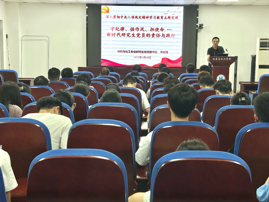 5月28日,化学与化工学院材料与化工专业研究生党支部书记李宏强以“守纪律、强作风、担使命——新时代研究生党员的责任与践行”为题,为支部全体党员讲授专题党课,结合中央八项规定精神内涵与研究生成长实际,锚定“守纪律、强作风、担使命”三大重点展开解读。