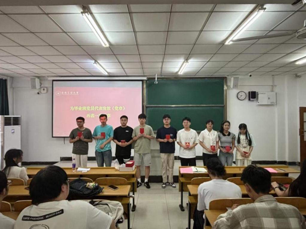 会上,与会教师为毕业生党员逐一佩戴党员徽章,并分发《中国共产党章程》。冀秀芝带领全体党员重温党章,重点学习了党员的权利与义务、党的纪律等内容,并勉励毕业生党员“离校不离党、毕业不褪色”,始终以党章为镜,永葆共产党人的政治本色。