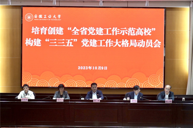 校党委副书记、校长魏先文解读了《中共安徽工业大学委员会关于培育创建“全省党建工作示范高校”构建“三三五”党建工作大格局的实施方案》,从指导思想和总体思路,培育创建目标,培育创建内容、责任分工和完成时限,阶段性工作目标、计划,培育创建工作保障等五个方面,对实施方案进行了讲解,介绍了“154”高质量党建工作体系、“六位一体”党建责任体系、“1+2+2”党建工作质量标准体系等“三大体系”;二级党组织“党员之家”建设,“党务工作电子平台”系统,“安工大党建e家”信息管理系统等“三大平台”以及大力实施党建“五提工程”的具体内容。他要求大家对照实施方案,狠抓工作落实。
