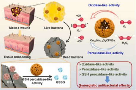 (6) Konglin Wu,# Dongdong Zhu,# Xingliang Dai,# Wanni Wang, Xiaoyan Zhong, Zhaobin Fang, Cheng Peng, Xianwen Wei, Haisheng Qian, Xulin Chen, Xianwen Wang*, Zhengbao Zha*, and Liang Cheng*, Bimetallic oxides Cu1.5Mn1.5O4 cage-like frame nanospheres with triple enzyme-like activities for bacterial-Infected wound therapy, Nano Today, 2022, 43, 101380.