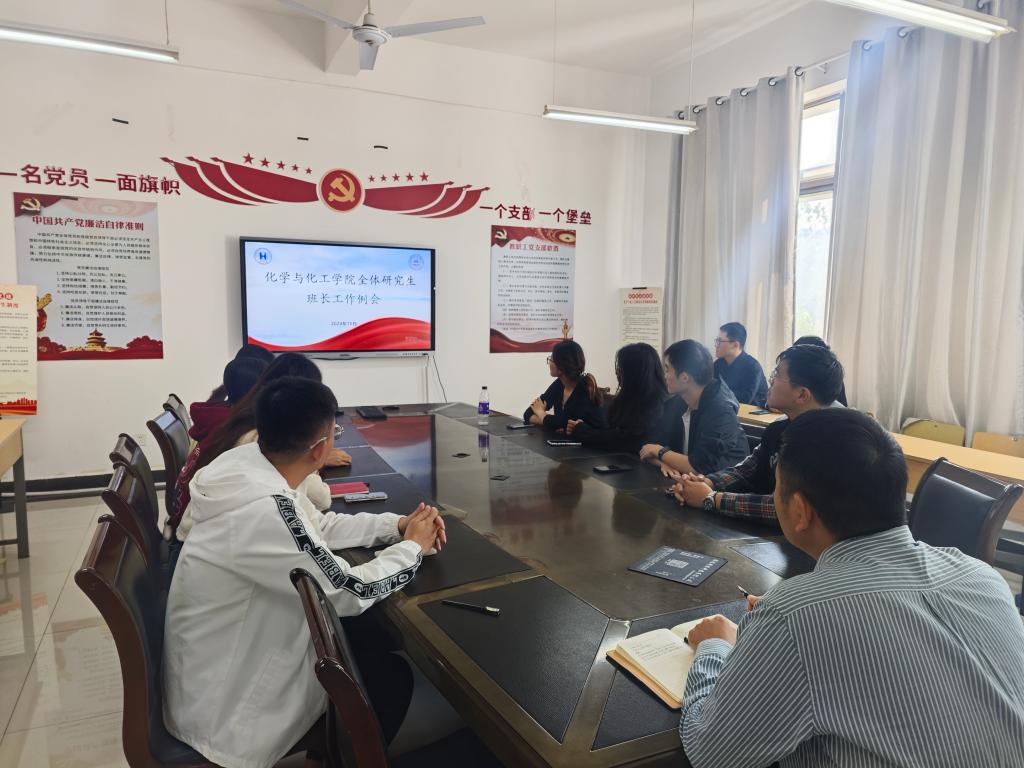 为落实学校、学院部署的2024年秋季学期各项学生工作,进一步加强班级建设,提升班长的工作能力与服务水平,10月11日上午,化学与化工学院在化工南楼213室召开了研究生班长工作会议,会议由研究生辅导员李冰心主持。