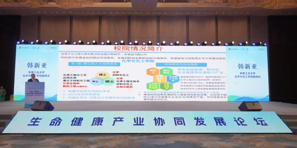 11月24日,由安徽省科技厅、省卫生健康委、马鞍山市人民政府共同主办,马鞍山市科技局、马鞍山市卫生健康委、马鞍山市投资促进中心、慈湖高新区管委会和安徽皓元药业有限公司联合承办的“安徽‘双创汇’走进马鞍山慈湖高新区暨生命健康产业协同发展论坛”在我市举行。省科技厅、卫健委领导、马鞍山市政府领导、各市直机构领导、马鞍山慈湖高新区领导及相关部门负责人、高校院所、国内外生物医药产业企业负责人、产业资本、服务机构等共约180人参会。本次活动旨在通过开展学术交流、分享创新成果,积极推动我市生命健康产业的高质量发展。安徽工业大学郑啸副校长以及化学与化工学院党委书记黄宇弦、副院长韩新亚等出席本次活动。