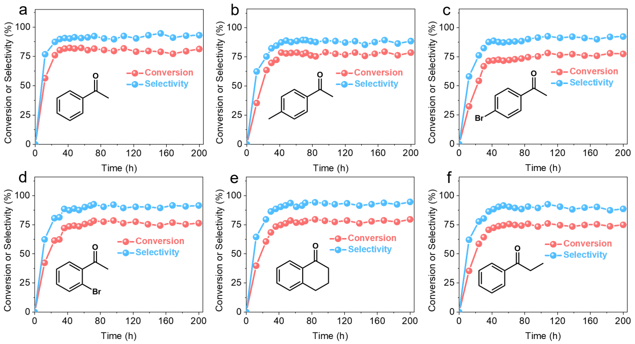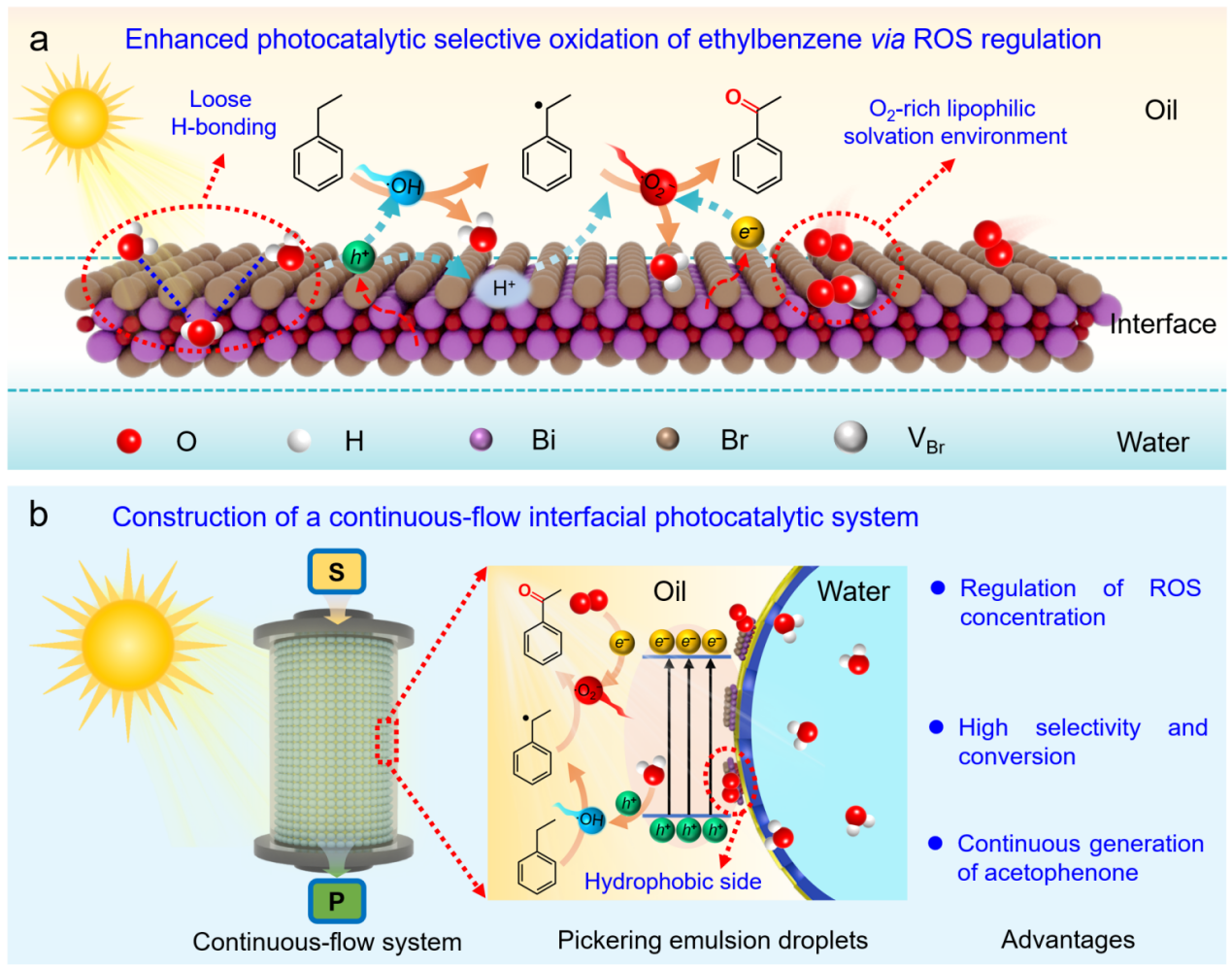 针对上述难题,研究团队设计了一种以改性二氧化硅(SiO2)为乳化剂、溴氧化铋(BiOBr)为光催化剂的Pickering乳液界面光催化体系。通过将BiOBr精准固定于乳滴界面外侧,体系在可见光下有效促进有利的超氧阴离子自由基(∙O2‒)生成,同时抑制羟基自由基(∙OH)形成。在不添加任何牺牲剂的条件下,该体系实现>99.0%的乙苯转化率和>99.0%的苯乙酮选择性。机理研究进一步揭示,Pickering乳滴界面独特微环境是实现高选择性的关键:界面外侧松散的氢键抑制了水分子解离与∙OH的生成,有效防止了过度氧化;同时,界面外侧富氧疏水环境促进了氧气吸附与∙O2‒的形成,显著提升了界面反应动力学,从而在温和条件下实现苯乙酮的高选择性合成。为探索该技术的实际应用潜力,研究团队构建了一种连续流动光催化体系,克服了传统间歇反应中催化剂分离回收的难题。该体系在长达200小时的连续运行中表现出良好的稳定性,乙苯转化率维持在约81.6%,苯乙酮选择性约92.3%,展现出较好的应用前景。