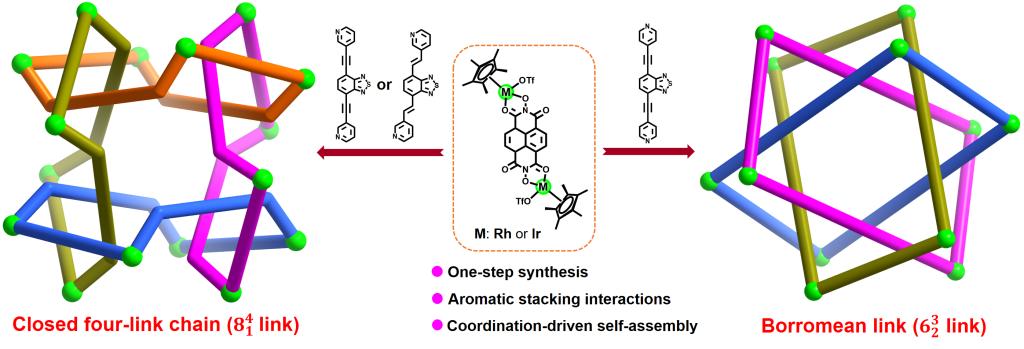 为了解决这一合成难题。近日,单威龙副教授在前期研究工作的基础上(Angew. Chem. Int. Ed. 2024, 63, e202402198. 高被引论文与金国新教授课题组合作提出了一种基于配位驱动和芳香堆积作用协同组装的合成新策略。通过双齿有机连接配体的巧妙设计和双核有机金属构筑单元的合理选择,利用该合成策略成功实现了一步法高效制备系列具有复杂拓扑结构的有机金属闭合四环链和Borromean环超分子化合物。
