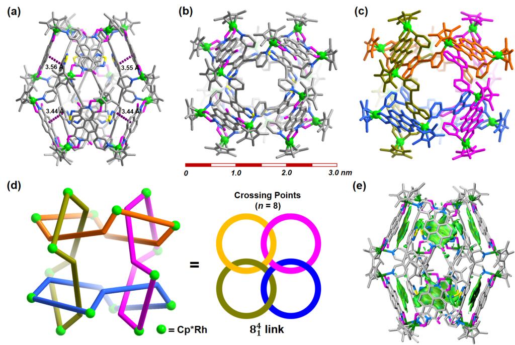 蛋白质和DNA分子中存在的机械互锁分子(MIMs)不仅是自然界的艺术创造,而且在基因的复制和转录过程中同样发挥着重要的生物学作用。这种互锁分子的内在复杂性和功能性激发了化学家利用合成化学的方法创造此类结构的浓厚兴趣。目前,一些具有复杂拓扑结构的MIM分子如索烃轮烷互锁笼和分子结等已经成功地通过金属离子模板、阴离子模板、π-π堆叠作用和疏溶剂效应等合成策略制备得到。但是,对于闭合分子链超分子的高效制备仍然是非常困难的。直到2018年,Komiyama等才通过三阶段合成策略合成了首例闭合三环链分子。而对于闭合四环链等更高阶的分子链拓扑结构的合成还存在着巨大的挑战。源于这种复杂的拓扑结构中,四个互锁且首尾相连大环的存在大大提高了结构的复杂性,并对其合成过程中提出了特殊的困难。