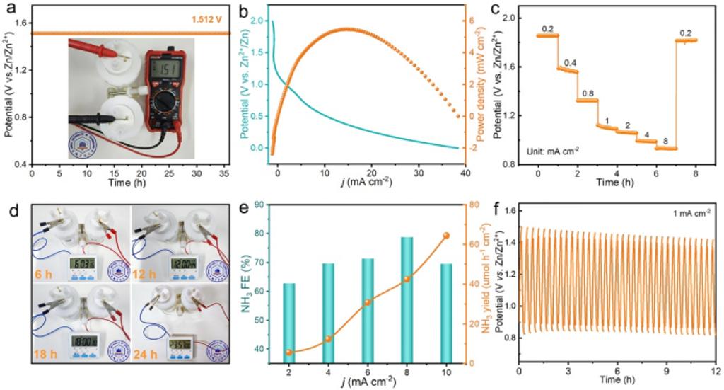 为了解决这一难题,曾杰教授团队开发了一种ZnO载体分散的Cu单原子合金氧化物催化剂(Cu1/ZnO)。该催化剂体系中,原子级分散的Cu位点增强了对硝酸根中间体(*NO3)的吸附,Cu位点协同ZnO载体中Zn位点促进了水解离生成活性氢并且抑制了活性氢脱附生成H2析出,从而为*NO3的加氢过程提供了充足的质子源,降低了反应速控步(*NO加氢生成*NHO)的能垒。最终实现了安培级电流密度(2.2 A cm-2)、高选择性(96.1%)、高产率(184.7 mg h-1 cm-2)电催化硝酸盐还原合成氨。此外,将Cu1/ZnO催化剂应用于可充电的Zn-NO3-电池,可以稳定的输出高达1.5 V的电压和5.5 mW cm-2的峰值功率密度,展现出了良好的应用潜力。该工作揭示了调控硝酸根及活性氢中间体吸附对提升NO3RR性能的重要性,为精准设计高活性的单原子合金氧化物催化剂提供了新思路。(撰稿:刘明凯;审核:韩新亚 黄宇弦)