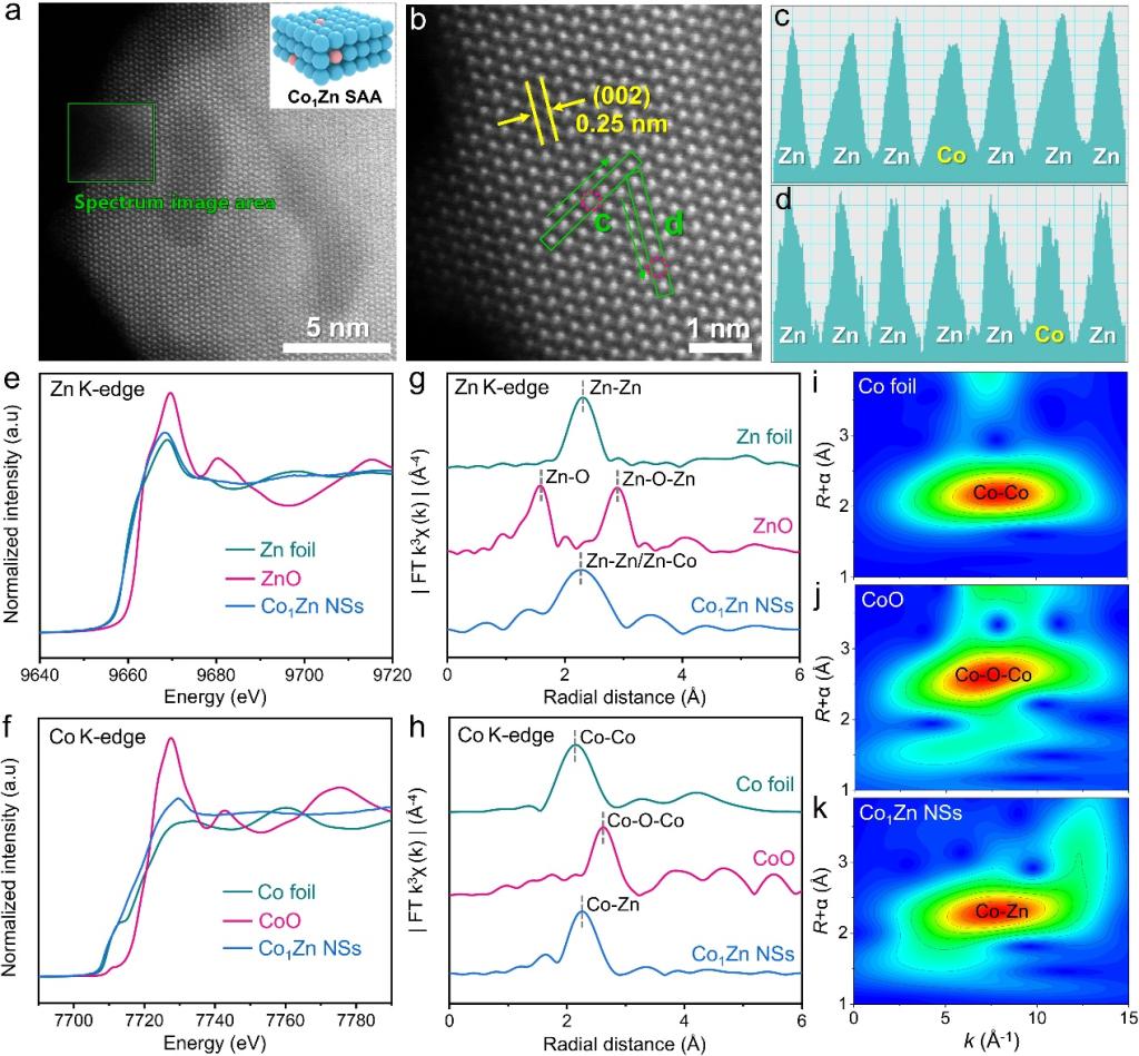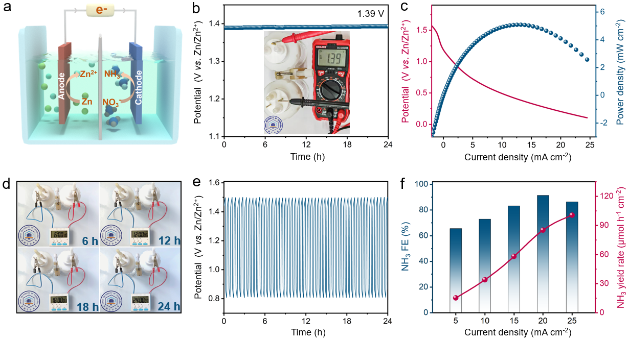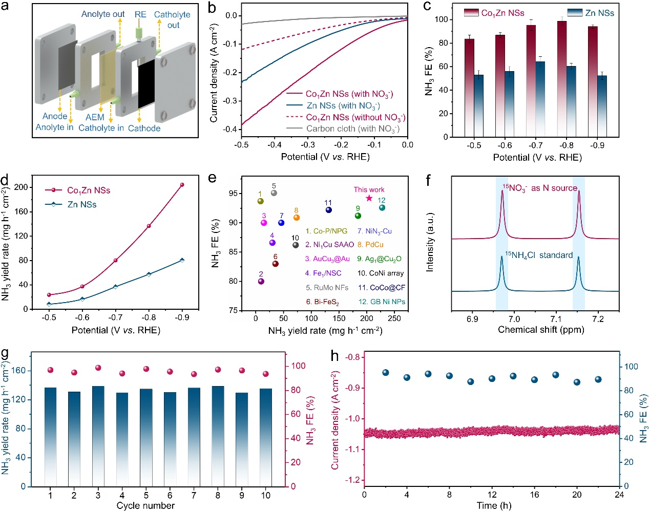 为了解决这一难题,曾杰教授团队通过精巧的单原子合金设计,开发了一种Co1Zn非贵金属氢溢流体系,成功的解决了电催化硝酸盐还原合成氨反应中活性氢的供应难题。凭借该催化体系中显著的氢溢流效应,在安培级电流密度下实现了硝酸盐到氨的高效催化转化。在流动电解池中,实现了高达2.4 A cm⁻2的合成氨反应电流密度和204.5 mg h⁻1cm⁻2的产氨速率,性能远超未形成氢溢流效应的Zn纳米片催化剂。此外,基于该催化剂组装的Zn-NO3⁻可充电电池展现出优异性能,可以稳定的输出1.39 V的电压和5.51 mW cm-2的峰值功率密度。本研究揭示了非金属合金体系中氢溢流机制的可行性,为电催化氢化反应的催化剂设计提供了一种新思路。(撰稿:刘明凯 审核:韩新亚 黄宇弦)