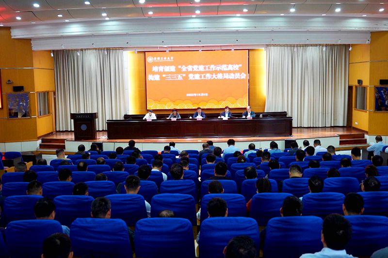 10月9日下午,学校在会议中心四楼报告厅召开培育创建“全省党建工作示范高校”构建“三三五”党建工作大格局动员会,全面部署今后一个时期党建示范校培育创建的具体工作,动员全校各级党组织、广大党员干部深入推进我校党建示范创建和质量创优,全力构建“三三五”党建工作大格局,全力促进我校党建工作高质量发展。全体在校校领导、党委常委,校党委委员、纪委委员,全体中层干部,支部书记代表参加会议。会议由校党委常委、副校长刘明主持。